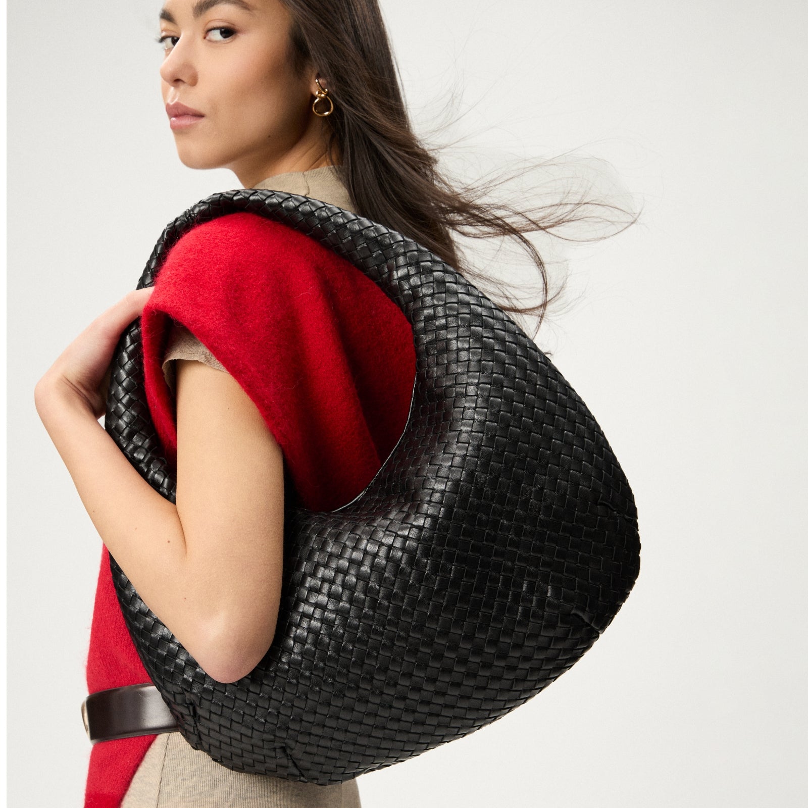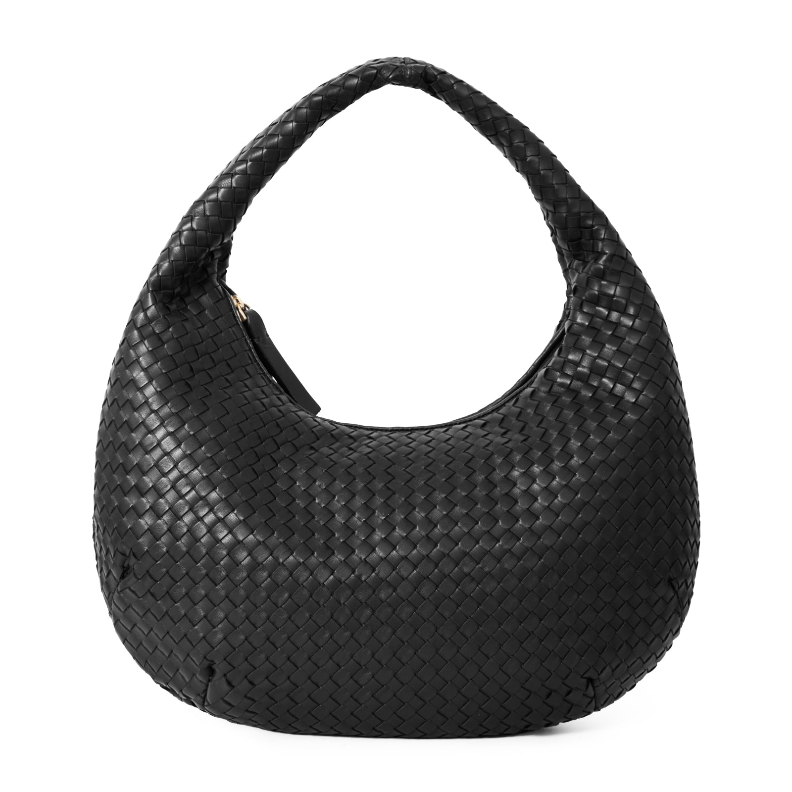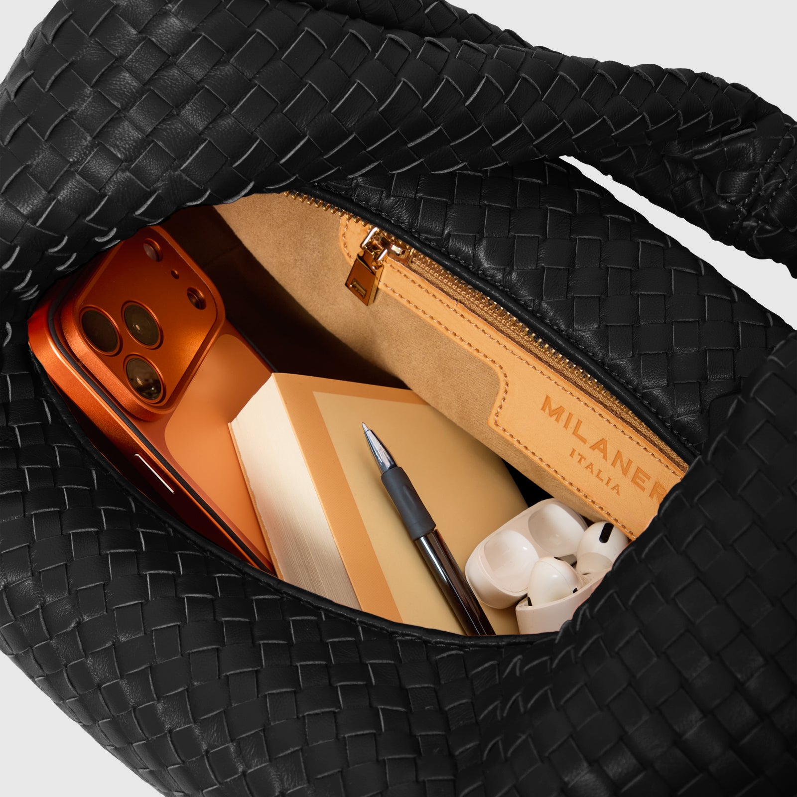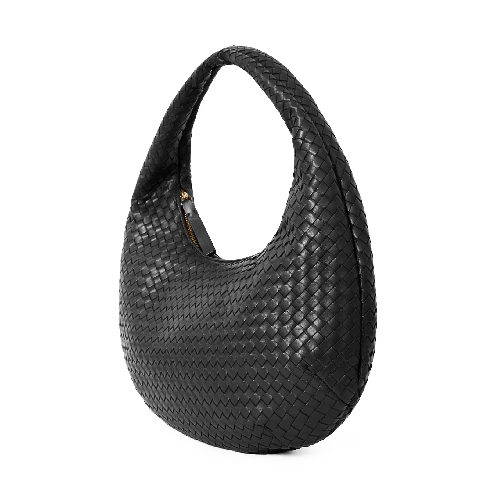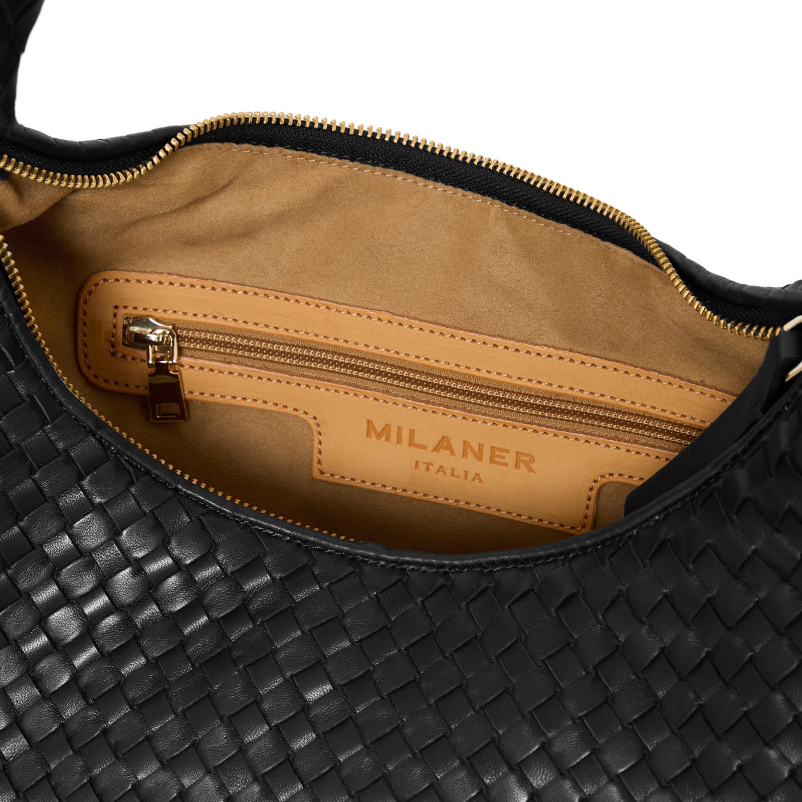 Rounded elegance, at your shoulder. Crafted from handwoven Italian leather, the Alba Woven Hobo bag offers a discretely practical shape with its soft, sophisticated structure and roomy, microsuede interior. Featuring two inside pockets, one open and one zippered, the Alba is a minimalist’s take with slight bohemian edge.