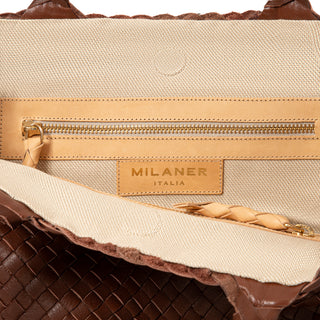 The Classic Elena is an iconic leather tote bag with a striking pattern upgrade. Handwoven in Italy from genuine Nappa or Suede leather, this woven bag features a 100% cotton lining, magnetic top closure and two zippered interior pockets to keep belongings safe and sound. Smaller than the Travel Elena, larger than the Mini Elena, it's a perfect in-between shape for every day wear.