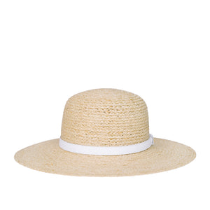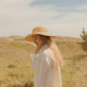 Ready for the sun, the Lisa Hat is crafted from lightweight, braided raffia and finished with a slim leather band. Woven by hand in Le Marche, Italy, this wide brimmed hat has a semi-rigid structure for casual wear that adds a polished, feminine layer to any ensemble.